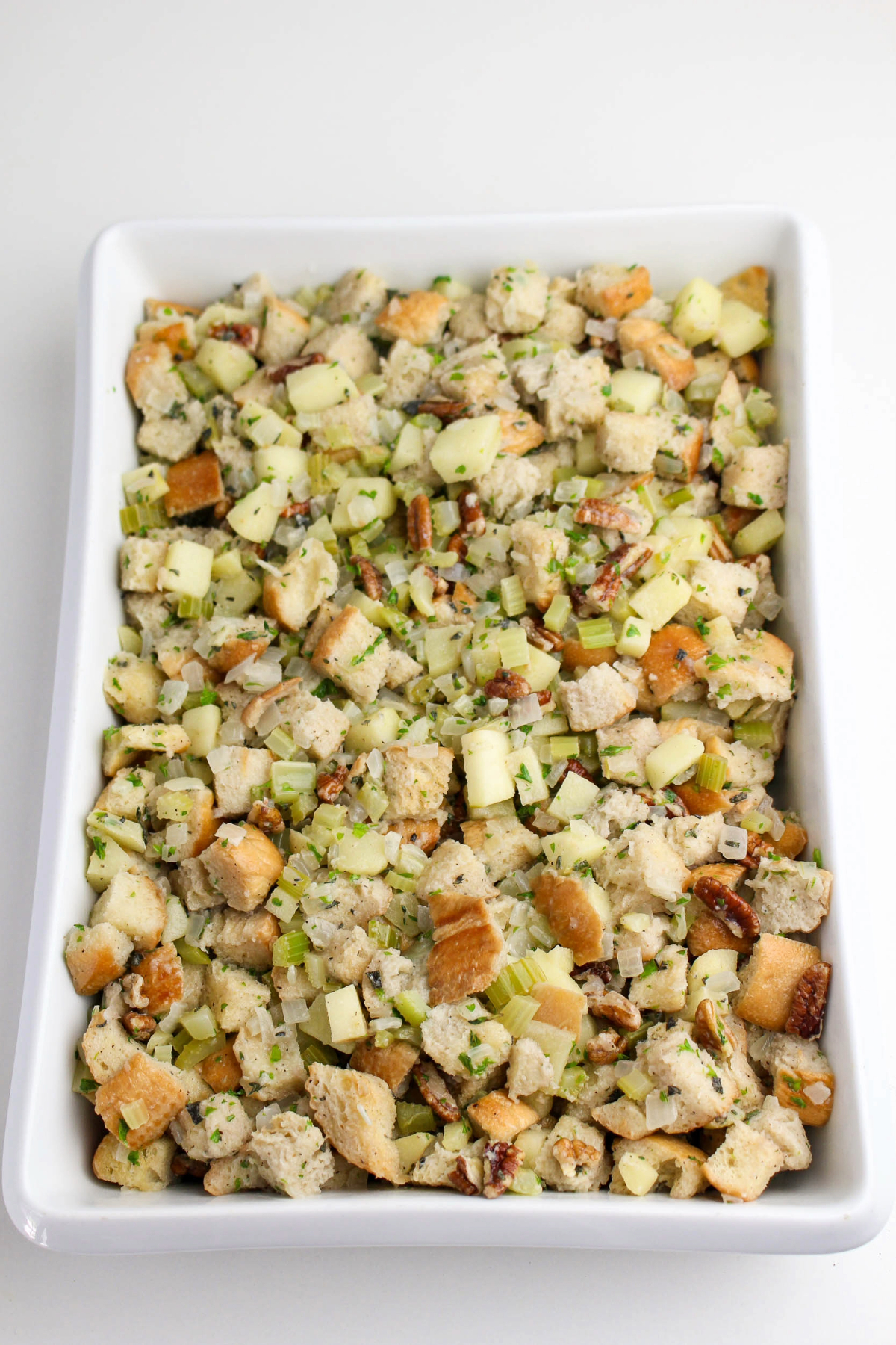 - Transfer bread to a big bowl. Add cooked veggies, apples, nuts, parsley, herbs, salt, and pepper.