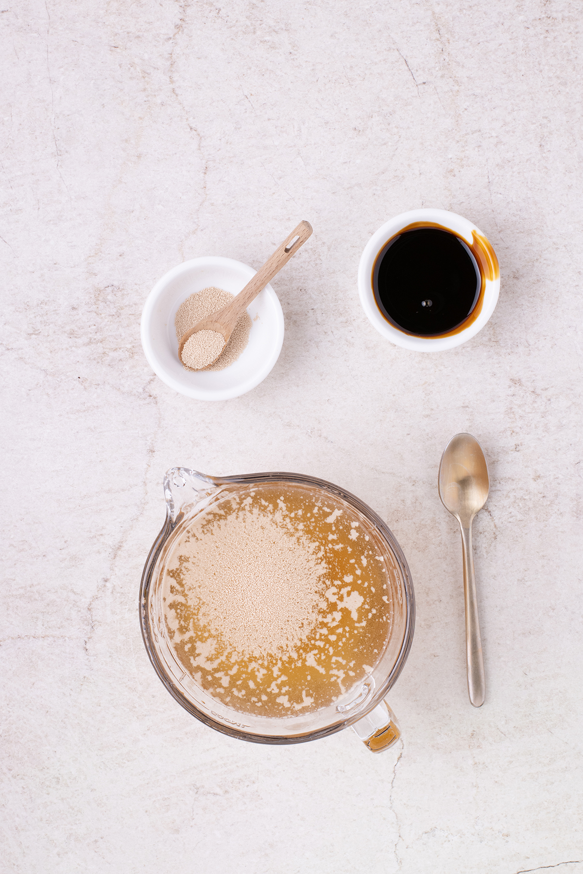 - Dissolve the molasses in the water and then sprinkle in the yeast. Mix with a spoon and let it sit undisturbed until the top starts to foam.