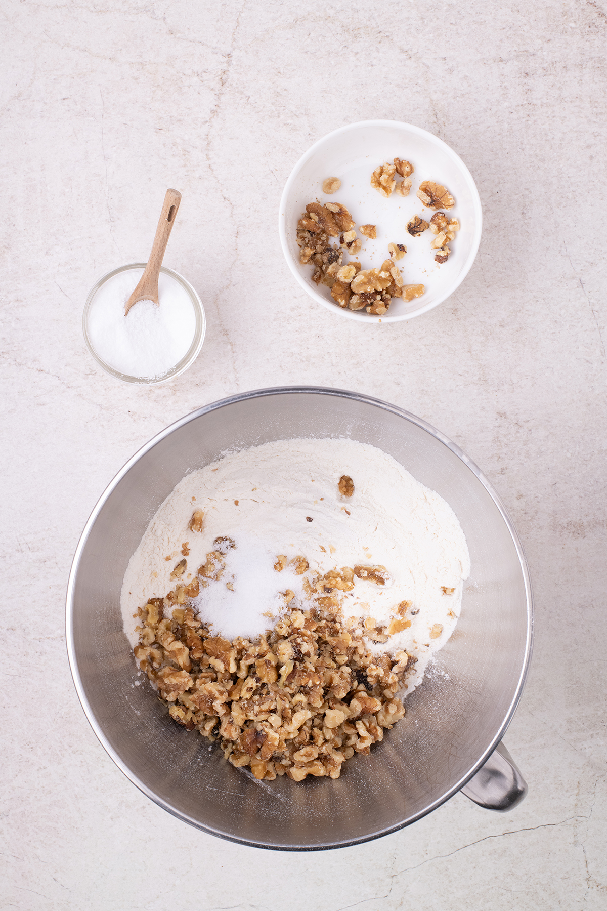 - In the bowl of a stand mixer, whisk together the bread flour, walnuts, and salt.