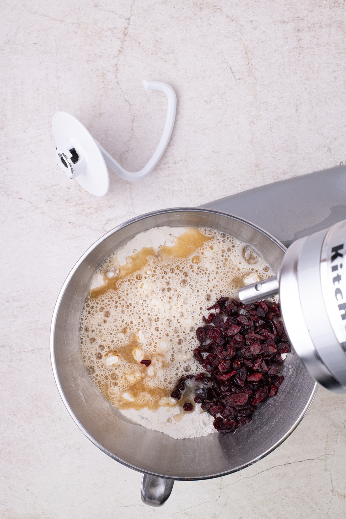 - Add the yeast mixture and cranberries. Mix at low speed using the dough hook attachment until it is combined.