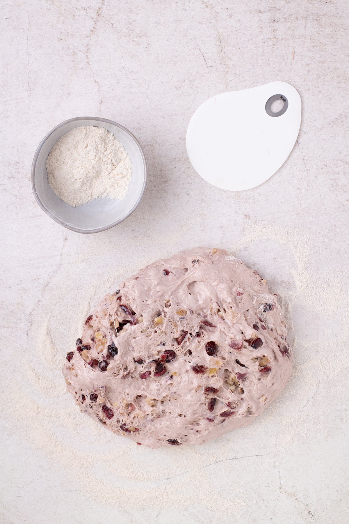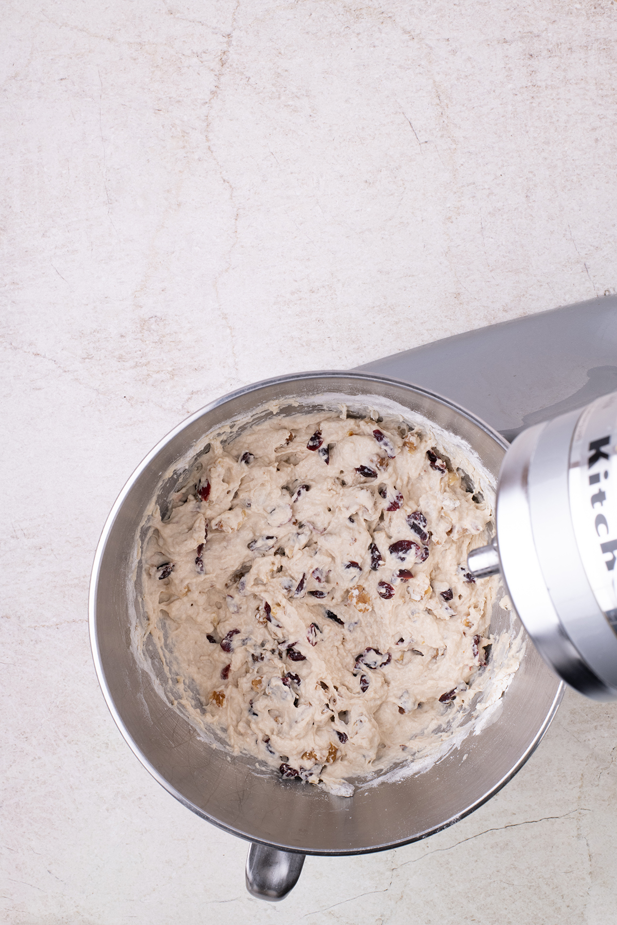 - Add the yeast mixture and cranberries. Mix at low speed using the dough hook attachment until it is combined. (The dough will be quite wet).
