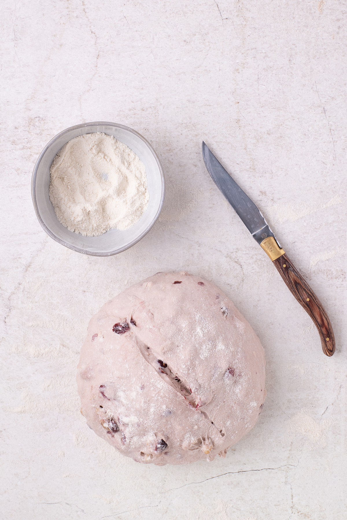 - Score (make a slit) on the top of the dough ball with a very sharp knife and let it rest for 5 minutes.